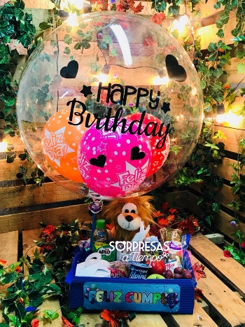 - 1 Globo burbuja grande con mensaje prediseñado, el peluche y la caja