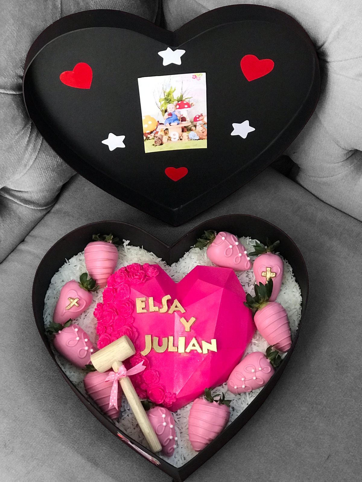 - 1 corazón de chocolate decorado con flores de chocolate relleno de gomitas